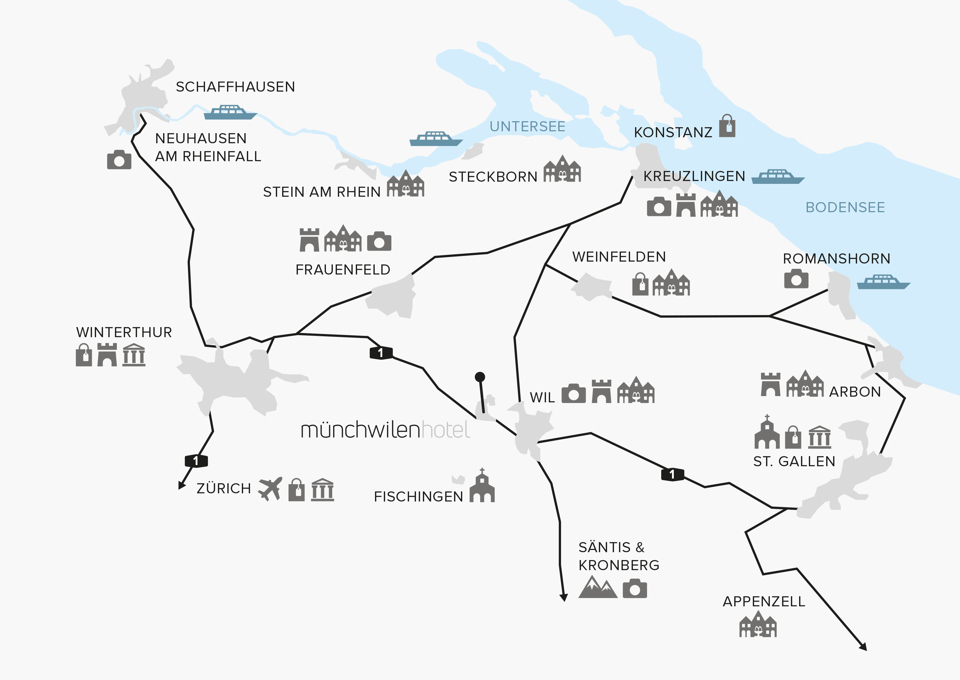 Zentral gelegen mit unter 45 km zu den Flughäfen Zürich ZRH und St. Gallen-Altenrhein ACH verfügt Münchwilen über eine Anbindung zur A1 (20 Minuten ab Winterthur und St. Gallen). Das Hotel liegt nur 2 Minuten von der Autobahn A1 entfernt.